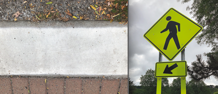In an effort to increase pedestrian traffic, the brick pavers have been outlined with a reflective white paint (also shown below, left). Existing signs, like the one above, are expected to be replaced with signs similar to what's shown below, right.