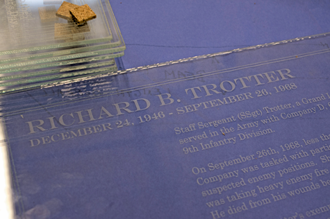 Etched glass biographies of Grand Island servicemen killed in action are moving closer to completion thanks to the efforts of Island benefactors and student volunteers working out of the Grand Island High School technology wing. Thursday, members of the DeGlopper Memorial Expansion Committee, which is working to improve DeGlopper Park in the center of town, saw etched glass engravings honoring Islanders killed in action (listed below). Students Ruby Benz and Justin Chadima undertook the technology end of the work in the school's science, technology, engineering and mathematics wing, while the Grand Island High School English Department proofread the bios. The glass (the Richard Trotter engraving is pictured below) bios will be located in DeGlopper Park on metal stands.