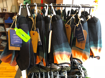 "Our tentree product here not only comes from sustainable products," but socks "are made from a product called REPREVE, and that's recycled bottles. For every item - every tentree product, you go online - you have this little disc - and you put in your tree code. You can select where you want to have your impact, but they'll plant 10 trees for every item. And their goal is, by 2030, to have planted over a billion trees around the world.