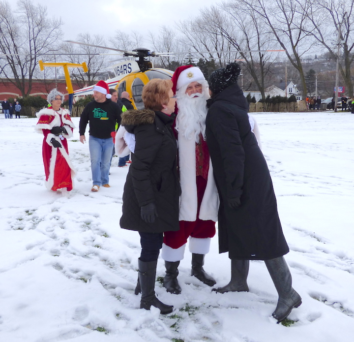 Upon his arrival, Santa is greeted by Mayor Anne Welch, left, and Niagara River Region Chamber of Commerce President Jennifer Pauly.