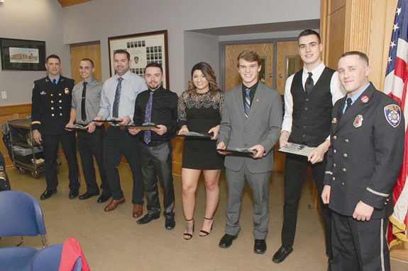 The 2018 recruiting class received certificates of completion of training from GIFC captains John Podlucky and Pat Hahn. From left: Podlucky, Tommy Shanor, Kevin Chalupka, Vinny Malpica, Graciana Giambra, Ryan Schwinn, Adam Crist and Hahn.