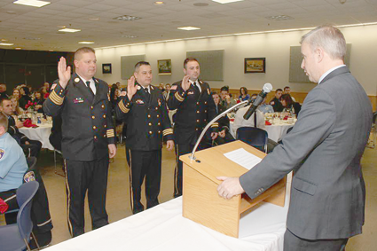From left, Jacobs administers the oaths to Deputy Chief Mark Sadkowski, 1st Assistant Chief Omar Sortino and 2nd Assistant Chief Dan Mathes.