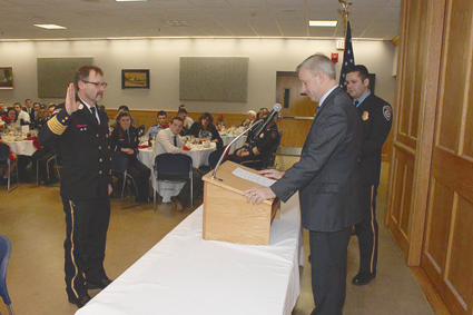 Matt Osinski takes the oath from Jacobs as fire chief.