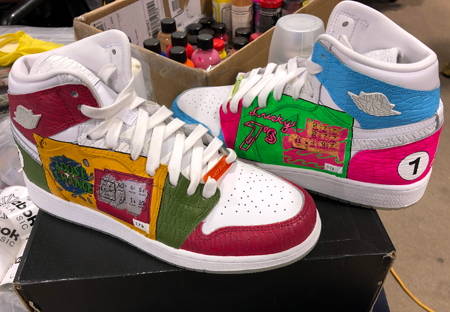 Some of her shoe work includes images for domestic violence awareness, corporate logos, scratch-off tickets, variations on the galaxy, and pop-culture – such as the movie “Space Jam.”