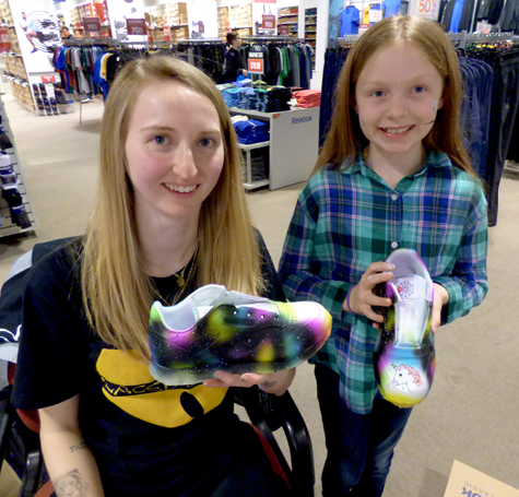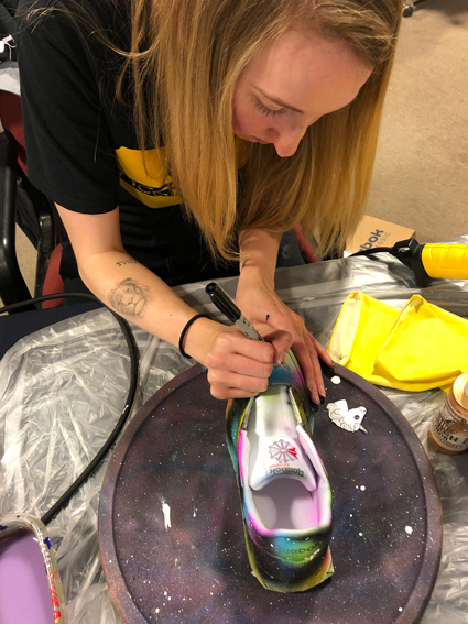 At the time of this interview, Liv was creating a hybrid rainbow-galaxy set of shoes for 9-year-old Ireland O’Connor of Lewiston. The artist would alternate between colored airbrushes and something that resembled a mini-hair dryer. Liv said the heat enables the paint to set faster and more permanently.