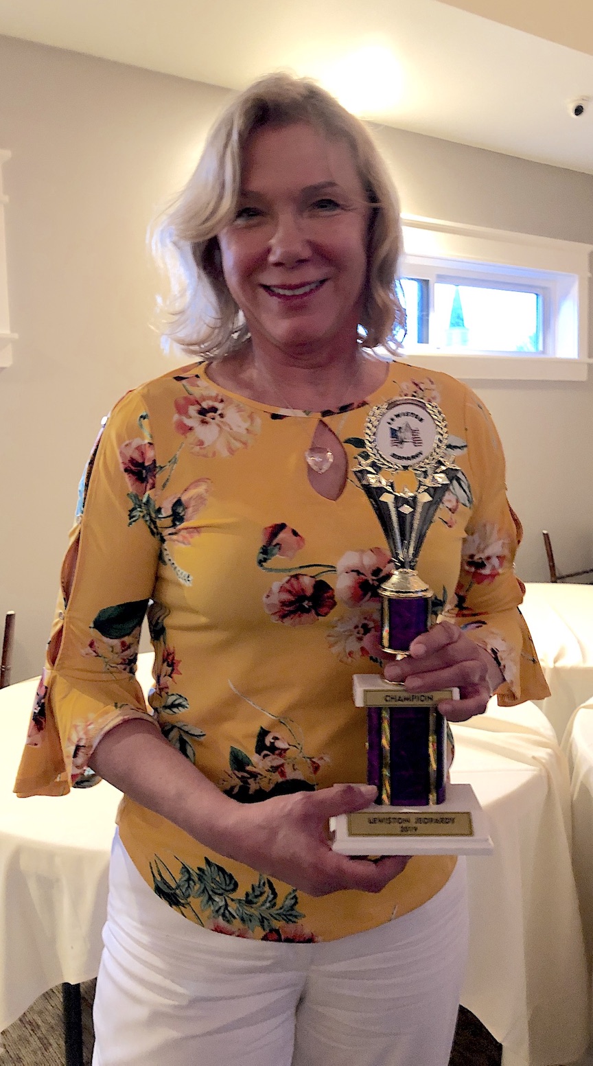 As the nation continues to be captivated by Holzhauer – the million-dollar man on “Jeopardy!” – it was Sandy Blackwell Yates who put on a show Saturday night at the Brickyard Brewing Company. She captained her team to a resounding victory in “Lewiston Jeopardy,” earning a large trophy and the applause of an impressed audience.