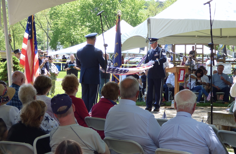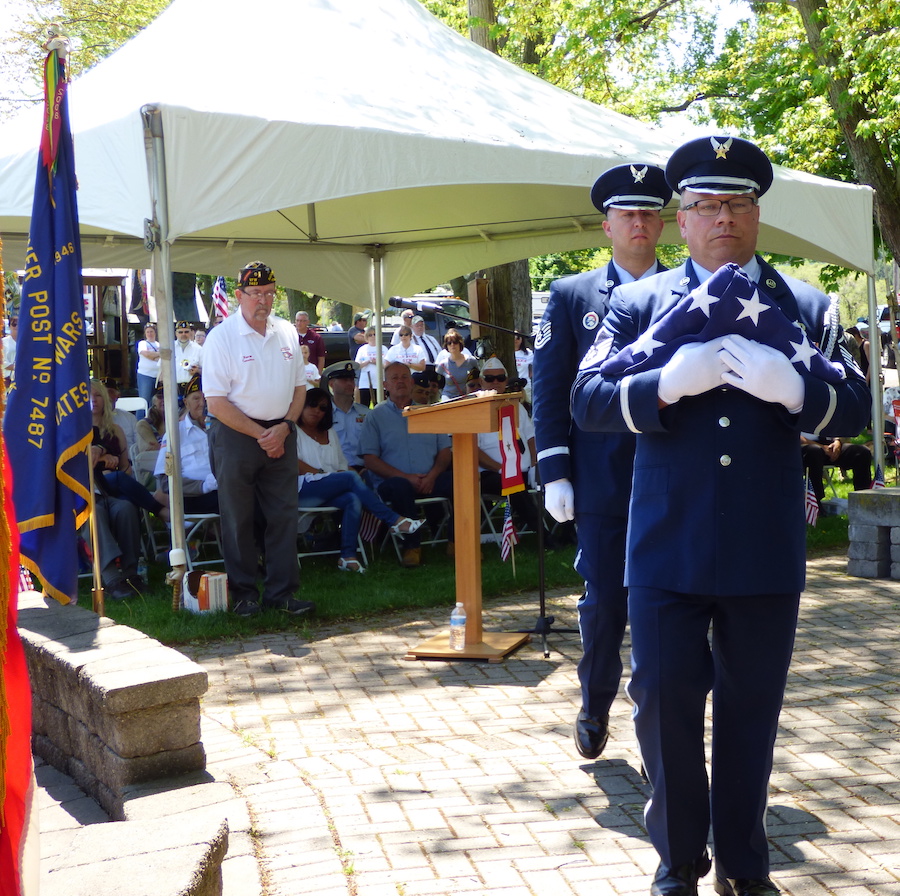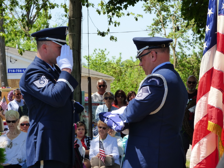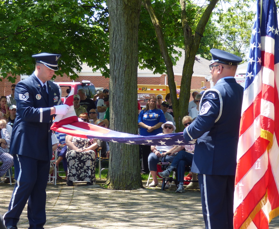 Revolutionary War reenactors were on hand; the Niagara Falls Air Force Station provided a precise military honors flag-folding ceremony; Karl Miller of Bugles Across America performed taps; and Hosingtons Ranging Company offered a black powder rifle salute.