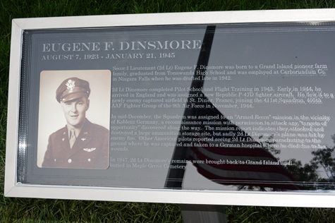 A flag at half-staff reflects off the new marker in DeGlopper Memorial Park remembering Eugene Dinsmore, who died in World War II. (Photo by Robert Haag)