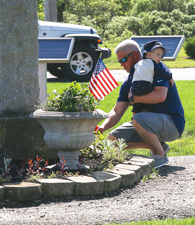 Chris Taylor lays a flower at the stone in DeGlopper Memorial Park during the roll call of names of Islanders who lost their lives in the nation’s wars.