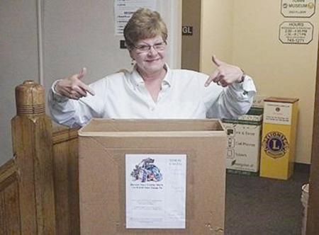 Librarian Marlene Wessel at the Red Brick shoe collection box.