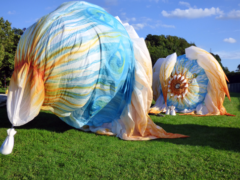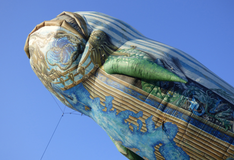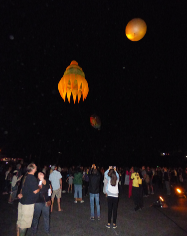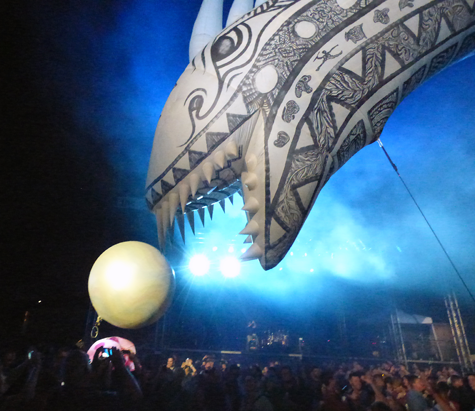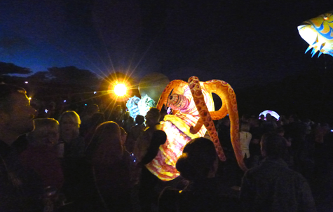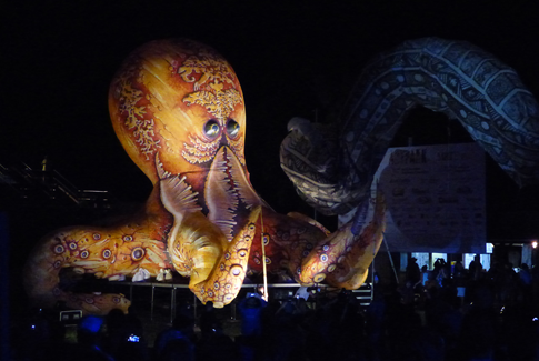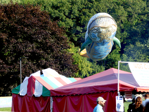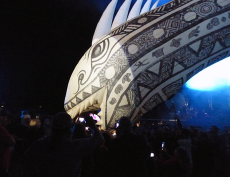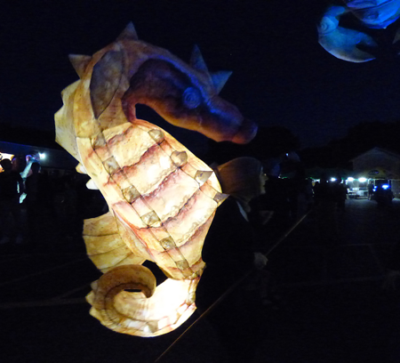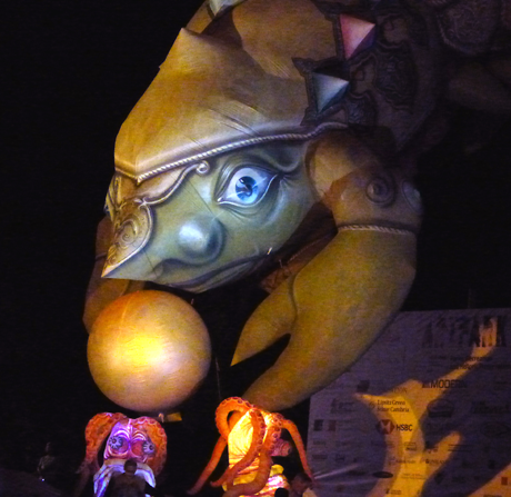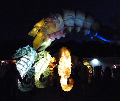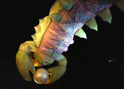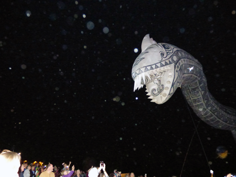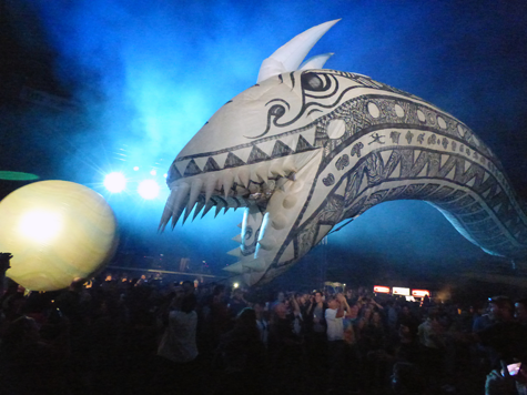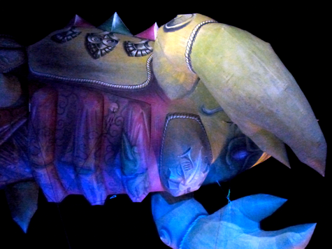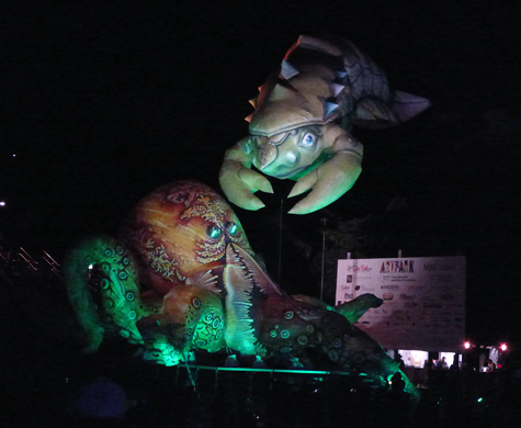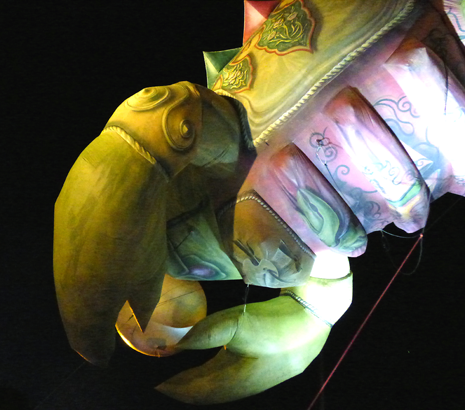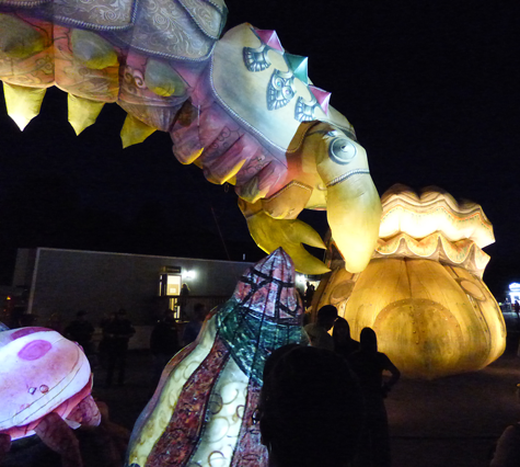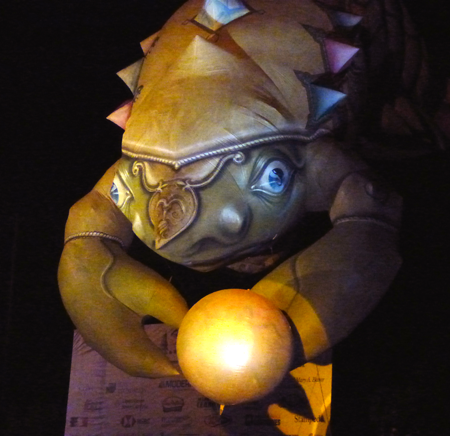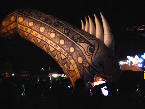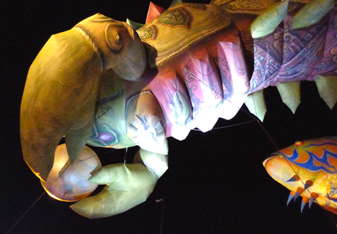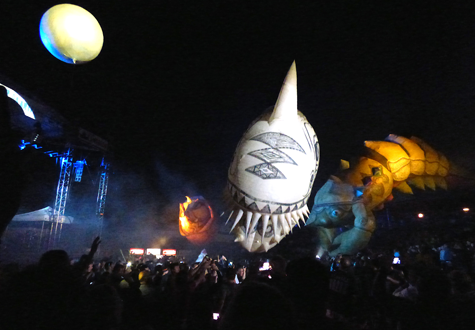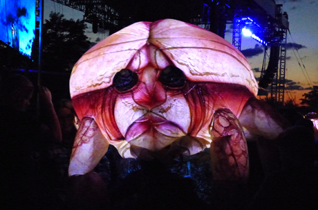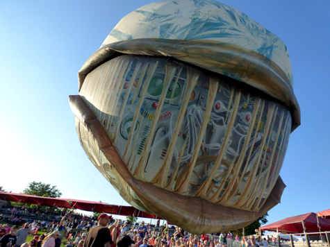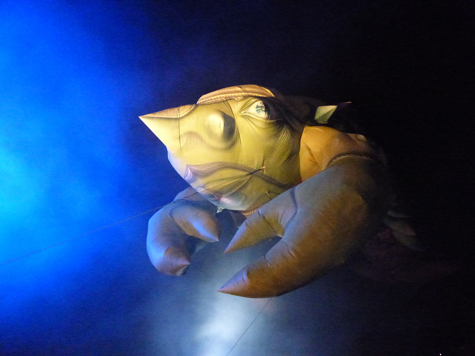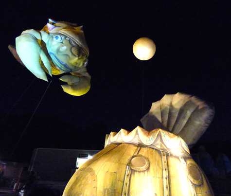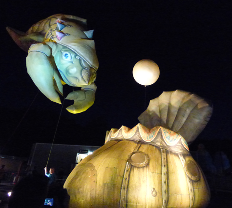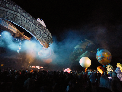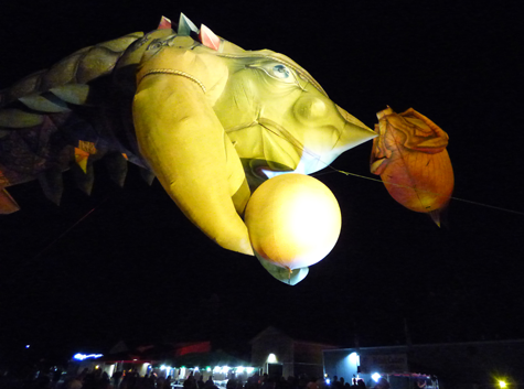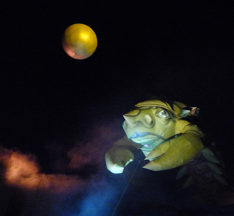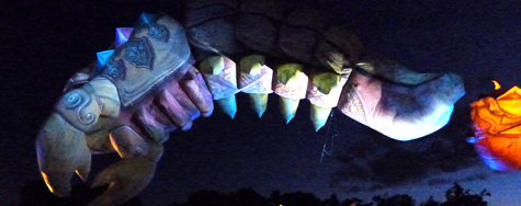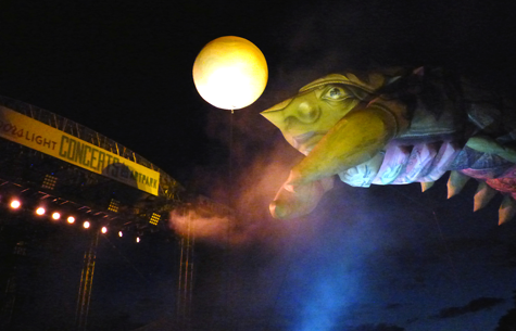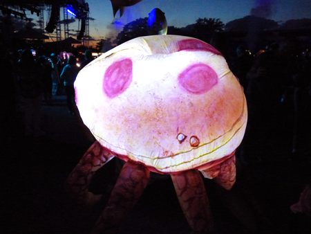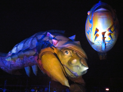 Patrons were on stage, of sorts, as the show took place in the sky, on the ground, and all around them. Costumed characters and inflatables weaved in and out of the crowd, as larger creatures took flight.