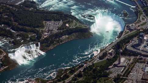 A panoramic view of Niagara Falls taken aboard the Skydive the Falls Cessna 206, from 6,700 feet.