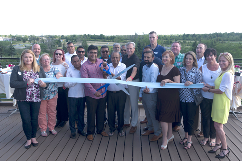 Anil Dholakiya and Raman Patel of Rudra Management had the honor of cutting the ceremonial blue ribbon at the opening of the Burrata Rooftop Bistro on the Holiday Inn Express. The event was hosted by the Grand Island Chamber of Commerce Friday at the new bistro, overlooking the Island. (Photos by Larry Austin)