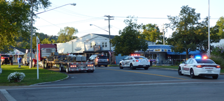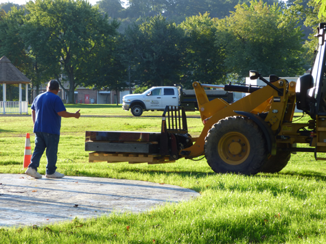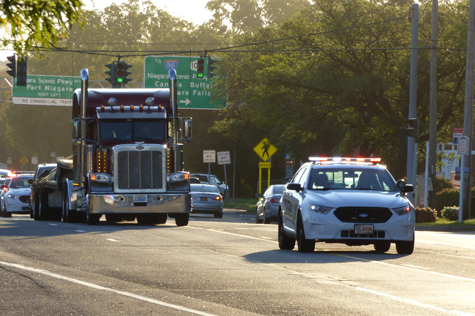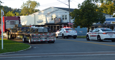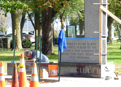Veterans of Foreign Wars Downriver Post 7487’s “Circle of Honor” started to be assembled on Wednesday morning. Patrol cars from the Lewiston Police Department and Niagara County Sheriff’s Office escorted stone pillars down Center Street and into Academy Park. Project manager Rocco DelGrosso and his team then began to install the monument pieces.