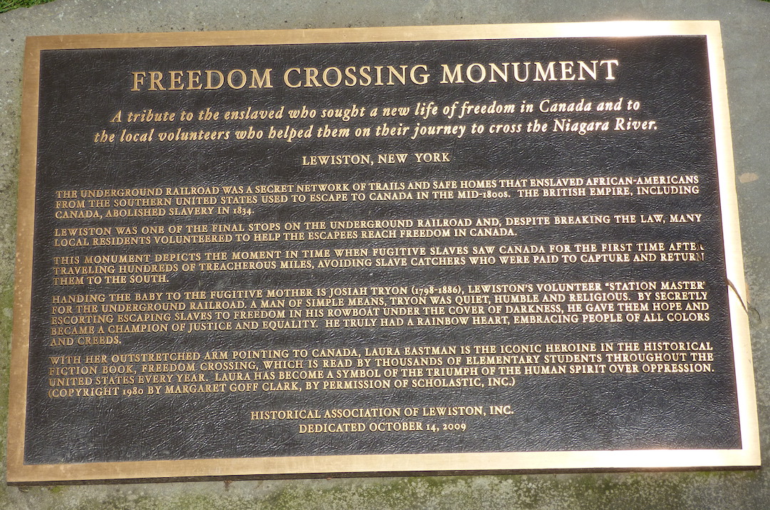 The Freedom Crossing Monument has become an iconic landmark in Lewiston. It was constructed by the Historical Association of Lewiston as a tribute to the enslaved who sought a new life of freedom in Canada, and to the local volunteers who helped them to cross the Niagara River on their journey to liberation.