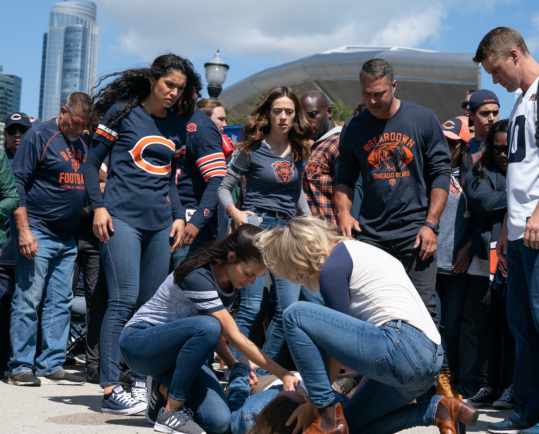 Springing to action at the scene of the outbreak are Stella Kidd (Miranda Rae Mayo), Natalie Manning (Torrey DeVitto), officer Kevin Atwater (LaRoyce Hawkins), Det. Jay Halstead (Jesse Lee Soffer), Sylvie Brett (Kara Killmer), Det. Hailey Upton (Tracy Spiridakos), Lt. Kelly Severide (Taylor Kinney), Matthew Casey (Jesse Spencer) and officer Kim Burgess (Marina Squerciati). (NBC photo by Sandy Morris)