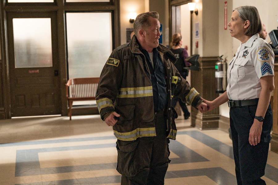 “Chicago P.D.”: Jason Beghe as Sgt. Hank Voight and Tracy Spiridakos as Det. Hailey Upton on the “One Chicago” crossover. (NBC photo by Liz Sisson)