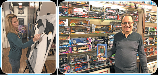 Kathy Pignatora works on a commissioned piece at Inspirations on Canvas, while Roger Passero shows off some of his unique inventory at Viva Nostalgia.