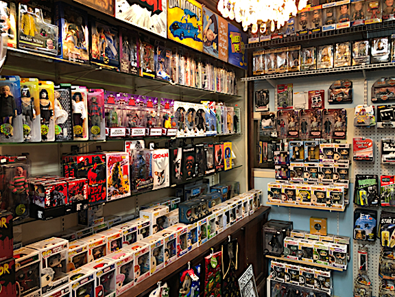 The store carries an assortment of pop culture classics – in everything from DVD to Blu-ray, classic action hero figures to modern-day Funko POP!, eyeglass cases to ceramic mugs, license plates to playing cards.
