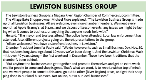 To a person, Lewiston business owners have high praise for the Niagara River Region Chamber of Commerce, the Lewiston Council on the Arts, and the Kiwanis Club of Lewiston, which are responsible for a handful of large, popular, profitable and well-publicized events each year.