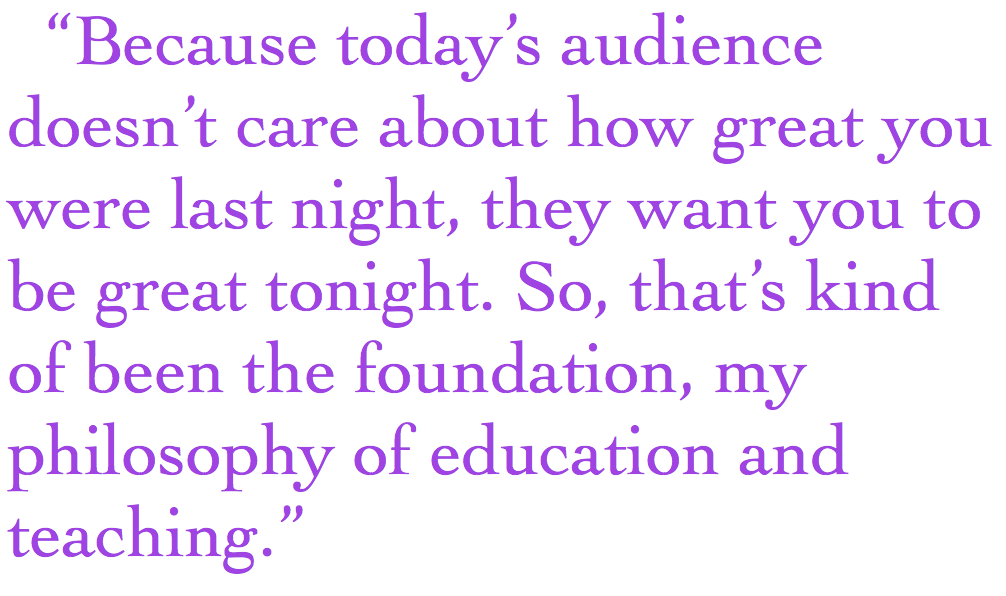 She strives to teach students to always give their all in everything they do. “Because today’s audience doesn’t care about how great you were last night, they want you to be great tonight,” she said. “So, that’s kind of been the foundation, my philosophy of education and teaching.”