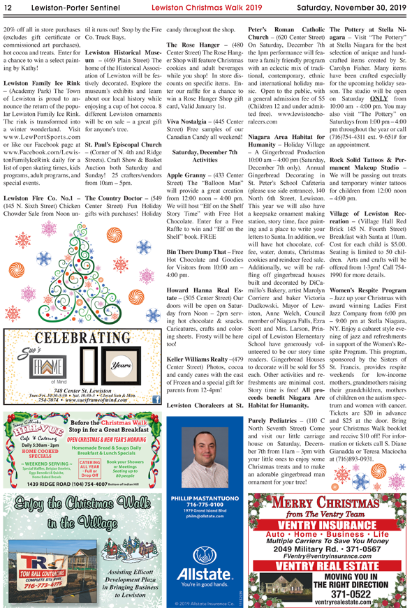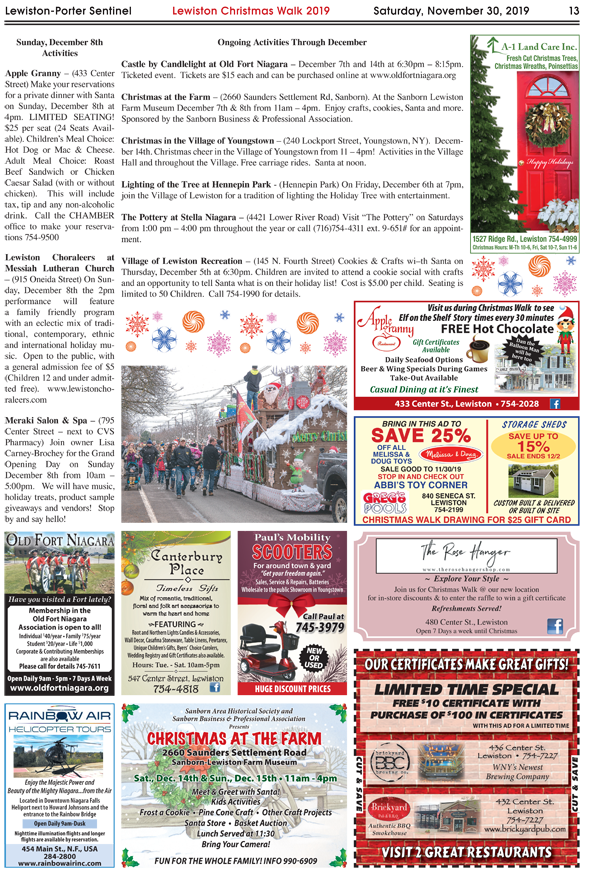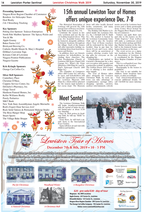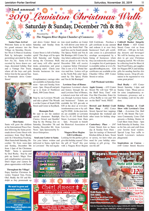 The Niagara River Region Chamber of Commerce invites the public to participate in the Lewiston Christmas Walk and Tour of Homes on Saturday and Sunday, Dec. 7 and 8. This kicks off the holiday season with Santa flying into Lewiston and landing in Academy Park between 11:15 and 11:30 a.m. Santa will then ride down Center Street to the International Peace Garden. After visiting Santa, families can head on down to see the animals at the petting zoo in Hennepin Park.