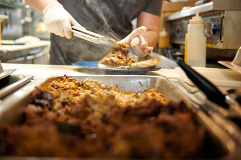 Cook Ben Bailey prepares some of the Brickyard's signature pulled-pork barbecue. (Photos by Mark Williams Jr.)