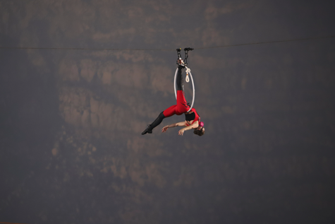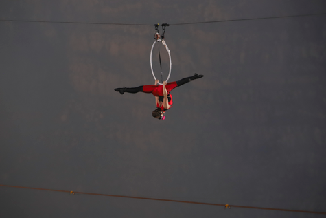 His wife, Erendira, opened the show with her most daring aerial performance to date above the volcano’s glowing lava lake. She was supposed to hang from a helicopter, but high winds kept the copter grounded. Instead, she performed off the highwire.