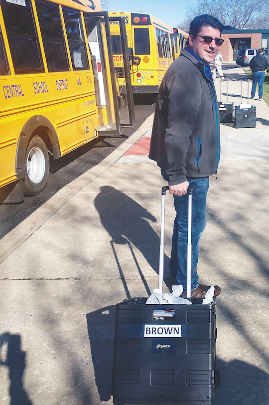 Huth Road Principal Max Pikula transporting Chromebooks to a bus for delivery to students