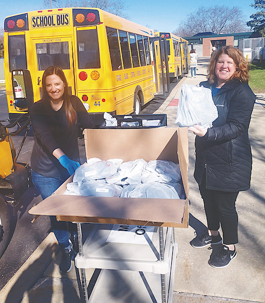 Jessica Brown, left, and Amy McMann load Chromebooks into a Grand Island School District bus.