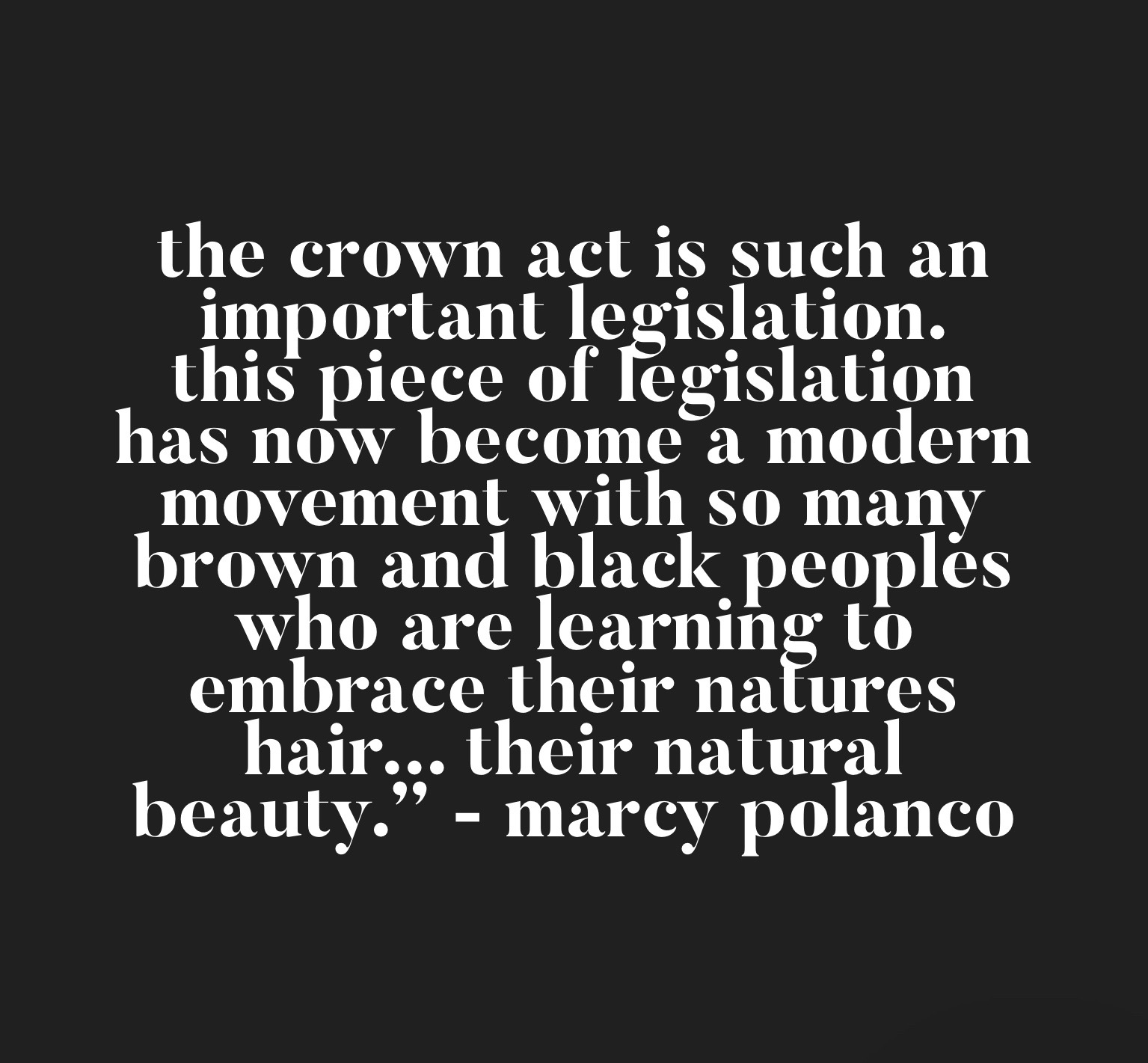 Polanco, who is also head of communications for JOY Collective, said, “The CROWN Act is an important step in ensuring that black and brown men, women and children in our schools and workplaces are protected and able to rock their natural hair without being discriminated against. Natural hair is beautiful. Period. No matter where they live or the color of their skin.”