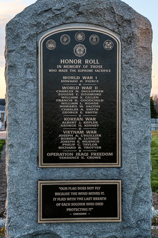 The KIA’s names and the wars they fought in are listed on a new plaque that was installed on the KIA monument in the middle of the park last weekend. Surrounding the monument are pedestals with each KIA’s photo and a short biography.
