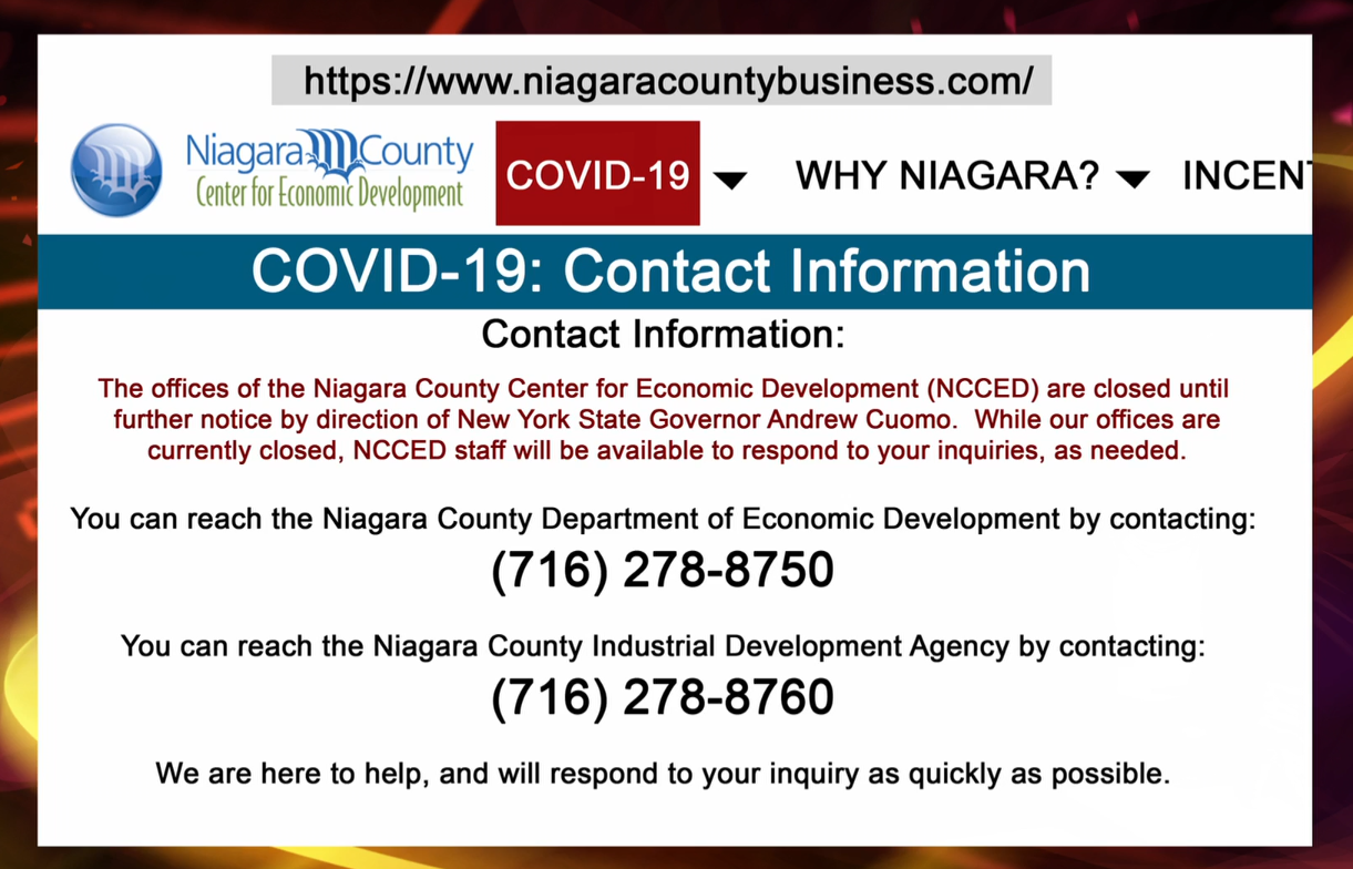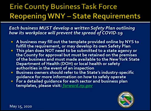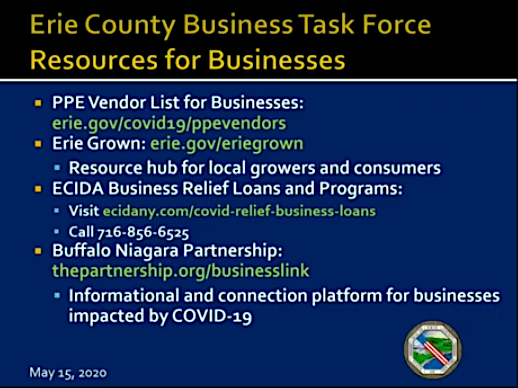 “Niagara County Emergency Services continues to have face coverings available. If you're a business that's putting together your plan and you want to have those on hand for when you're ready to open, you can email ncem@niagaracounty.com. And that department will help you get a supply of face coverings to have for your employees when you're ready to start reopening your business.”