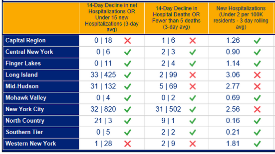 "Throughout this entire pandemic, New Yorkers have stepped up to the plate and done a great job of working together to bend the curve, and today half the regions in the state will begin to reopen," Cuomo said. "These regions have met the seven criteria needed for reopening, and as soon as other regions hit those benchmarks they can begin phase one of reopening as well. As we move forward with this process, it is up to all of us to understand our personal responsibility – that's how this worked from day one and that's how we will continue to slow the spread of the virus and start our new normal."