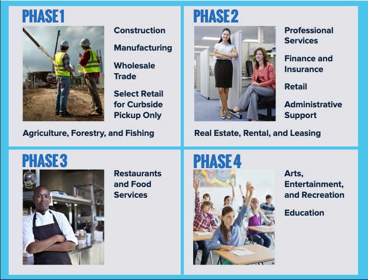 “The phase-in plan prioritizes businesses considered to have a greater economic impact and inherently low risks of infection for the workers and customers, followed by other businesses considered to have less economic impact, and those that present a higher risk of infection spread. Additionally, when phasing-in reopenings, regions must not open attractions or businesses that would draw a large number of visitors from outside the local area.”