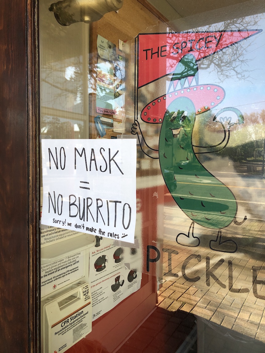 Spicey Pickle has a sign on the door: “No Mask = No Burrito.” Inside the restaurant, Plexiglas separates staffers from patrons.
