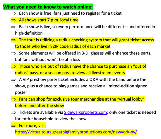 And we have a poll where fans can vote on a song for that night, and that night alone, to make it special. And so, that's what we wanted to make sure, when we went out on this virtual tour, that it felt like you were there. Even though you're in your living room or wherever you're at tuning in, we want it to be specifically for your state, for this region. And we want people to be able to come for free. We want you to be able to do that. And we have VIP stuff that, you know, we can hang out earlier and it costs a little bit of money just to help with the band stuff.