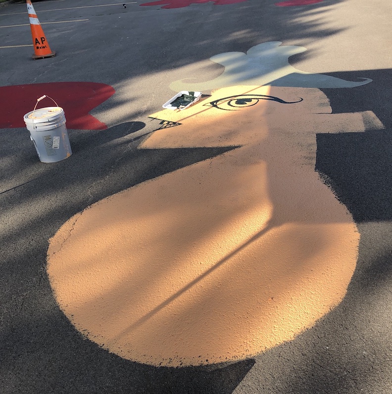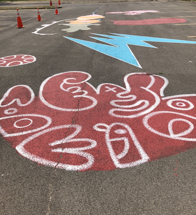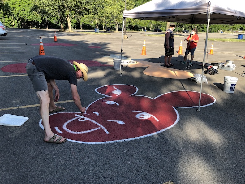 He added, “There's been … groups of people with special needs that we've been meeting with, doing Zoom meetings with. So far, we've just had, I think, four hours with the meeting … and basically what's been happening in those meetings is that people are kind of either showing us drawings that they're making, or through discussion Matt and I are basically taking little seeds of those conversations that are going to hopefully develop into imagery here in the parking lot. So, it could be something as simple as one guy had a nickname called ‘Bingo.’ So, the word ‘Bingo’ might show up in here.”