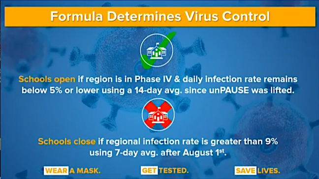 Schools will close if the regional infection rate rises above 9%, using a seven-day average, after Aug. 1.