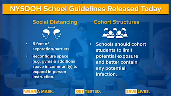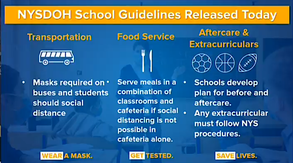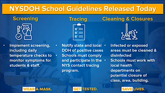 Gov. Andrew Cuomo on Monday announced new, data-driven guidance for reopening schools in New York. Schools in a region can reopen if that region is in phase four of reopening, and if its daily infection rate remains below 5% or lower using a 14-day average since “PAUSE” was lifted.