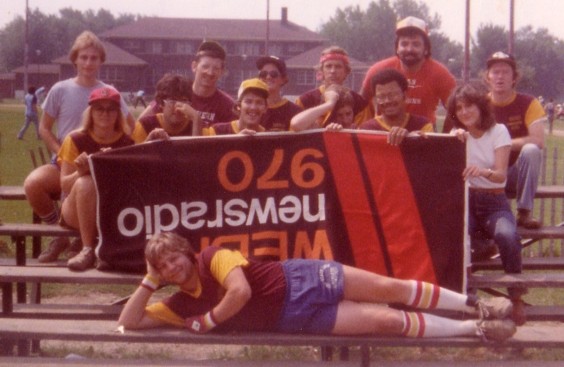 The WEBR softball team, circa 1978. The team was named the Revolving Doors because of the frequent staff turnover. Some team members seen in the photo: In front, Paul Hamilton; middle row, from left: Maureen Rasp-Glose, Budd Bailey, Brad Krohn, unidentified staffer, Greg Mott, Dawn Hamilton; back row, Scott Brown, Leon Thomas Lewek, Sally Lewek, unidentified reporter, Dennis Keefe and Sam Anson. (Photo courtesy Budd Bailey)