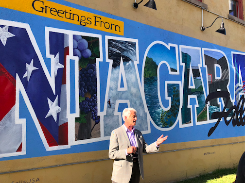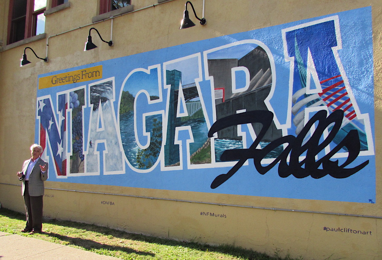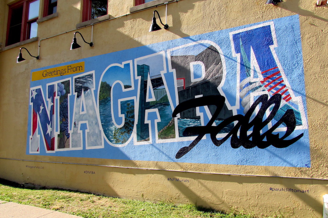 A postcard-inspired mural, “Greetings from Niagara Falls,” was conceived and painted by local freelance artist Paul Clifton. The DNFBA commissioned the work as a way to showcase Niagara County activities and welcome guests to Niagara Falls USA. Clifton created the mural over a period of four weeks.