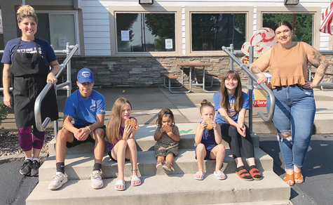 Village Bake Shoppe baker Chelsea Rosado and manager Casey Gillard (outside) and Hibbard’s Original Custard employees Zak Medecigo and Sydney Wade (seated) admire their work as Izzy and Emma Loughran and Jeana Fiore (center) enjoy the new ice cream sandwiches.