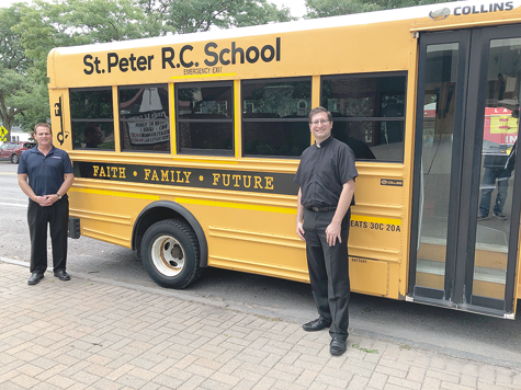 Pictured, from left: Robert Trunzo of Modern Corp. and St. Peter R.C. Parish Administrator the Rev. Cole Webster. Modern recently donated the new marketing wrap that can be seen on the bus. Webster said the vehicle would be used to reach out-of-area students who might be interested in attending the school, but lack bus transportation.