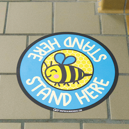St. Stephen School Principal Scott Gruenauer places signs on the floor of the cafetorium reminding students to social distance.
