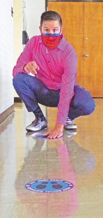 The floors in the cafeteria will remind Sidway students to social distance. At right, Sidway Elementary art teacher Matthew Doherty elbow bumps an incoming student off the buses. (Photo by Larry Austin)