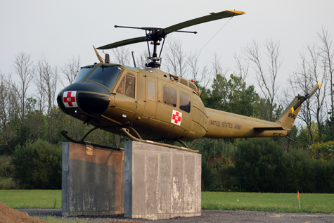 MacSwan then reached under his bench and produced a model Huey helicopter, along with commemorative photos of when crews hoisted the chopper onto its new stand.