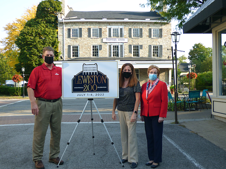Town of Lewiston Supervisor Steve Broderick, Village of Lewiston Mayor Anne Welch and Lewiston Bicentennial Chairperson Leandra Collesano (center) unveiled the official Lewiston Bicentennial Logo at the historic Frontier House on Friday.