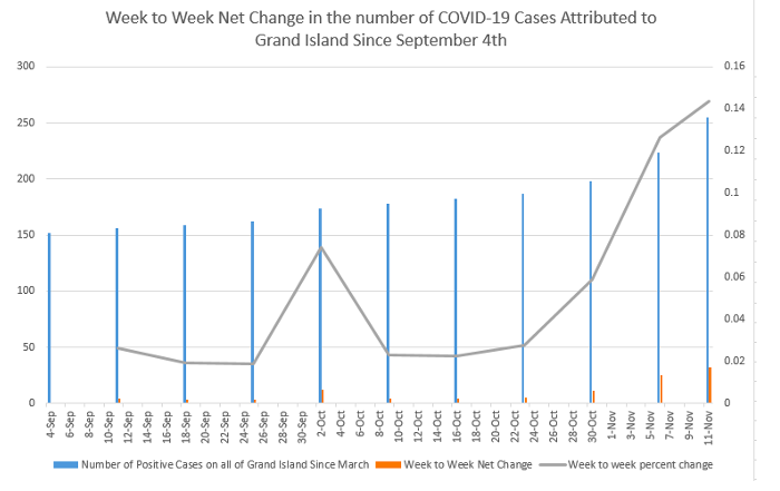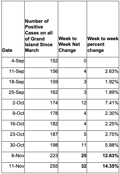 The chart shows the change in positive COVID-19 cases attributed to Grand Island (not the school system) starting the week of Sept. 4 and concluding on Nov. 11.