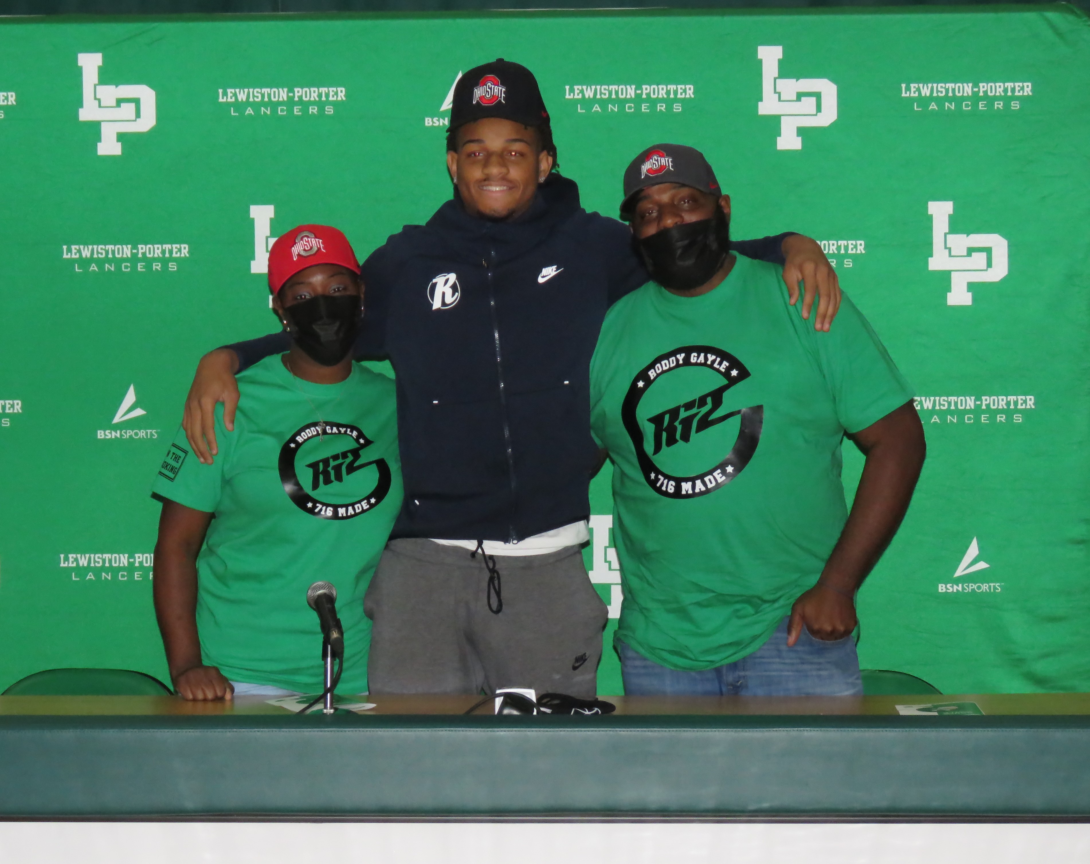 From left, Latoya Gayle, Roddy Gayle Jr. and Roddy Gayle Sr. pose for a photo following his committment to Ohio State University.